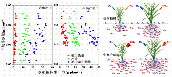 事实上,高产新品种不仅可以通过根系分泌物和凋落物的形式为稻田CH4产生菌提供更多的碳源,促进CH4产生过程;但同时还可以通过强大的通气组织(根系)为稻田CH4氧化菌提供更多的氧气,促进CH4氧化过程。当土壤贫瘠时,CH4产生的碳源主要来自当季光合产物,高产品种可以显著提高CH4产生进而增加排放。当土壤比较肥沃时,土壤有机碳源充足,但氧气不足,高产品种根际泌氧强,可以促进CH4氧化进而减少排放。可见,水稻高产新品种对稻田CH4排放的调控,是通过植株影响土壤碳源和氧源及微生物群落状况,是一个地上地下的互作过程。