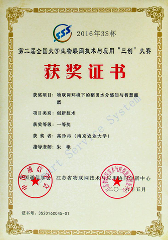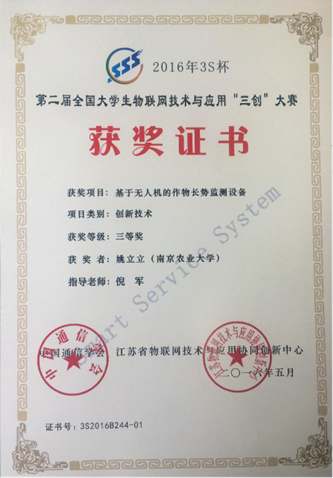 5月18日,第二届“3S杯”全国大学生物联网技术与应用“三创”大赛决赛结果在2016年全国物联网技术与应用大会暨ICT创新创业主题论坛上揭晓。DB彩票 共有两支队伍参赛,由朱艳教授指导的高珍冉、赵锡泽、孟琦翰团队参赛作品《物联网环境下的稻田水分感知与智慧灌溉》荣获创新技术类一等奖;倪军副教授指导的姚立立、李白琳、邰秀祥团队参赛作品《基于无人机的作物长势监测设备》荣获创新技术类三等奖。
