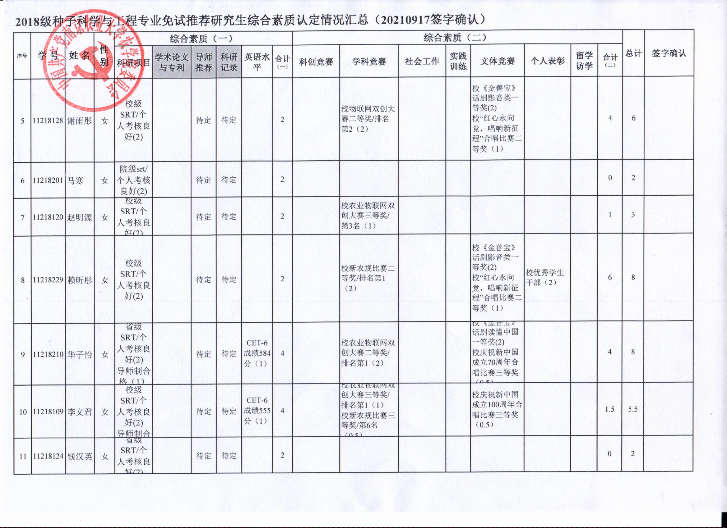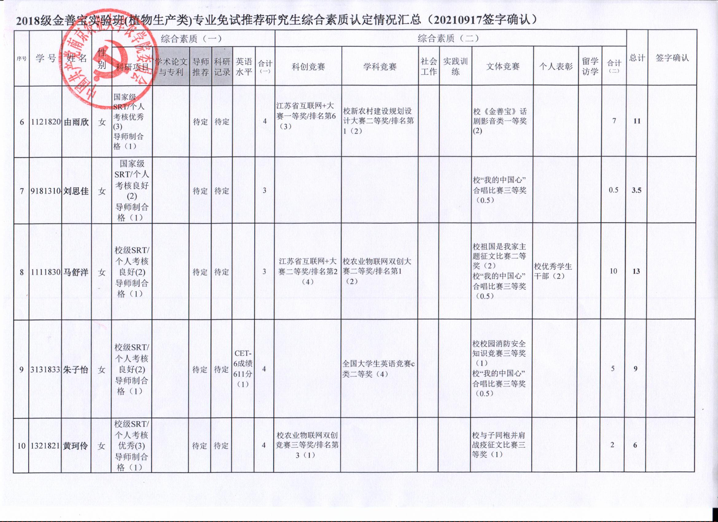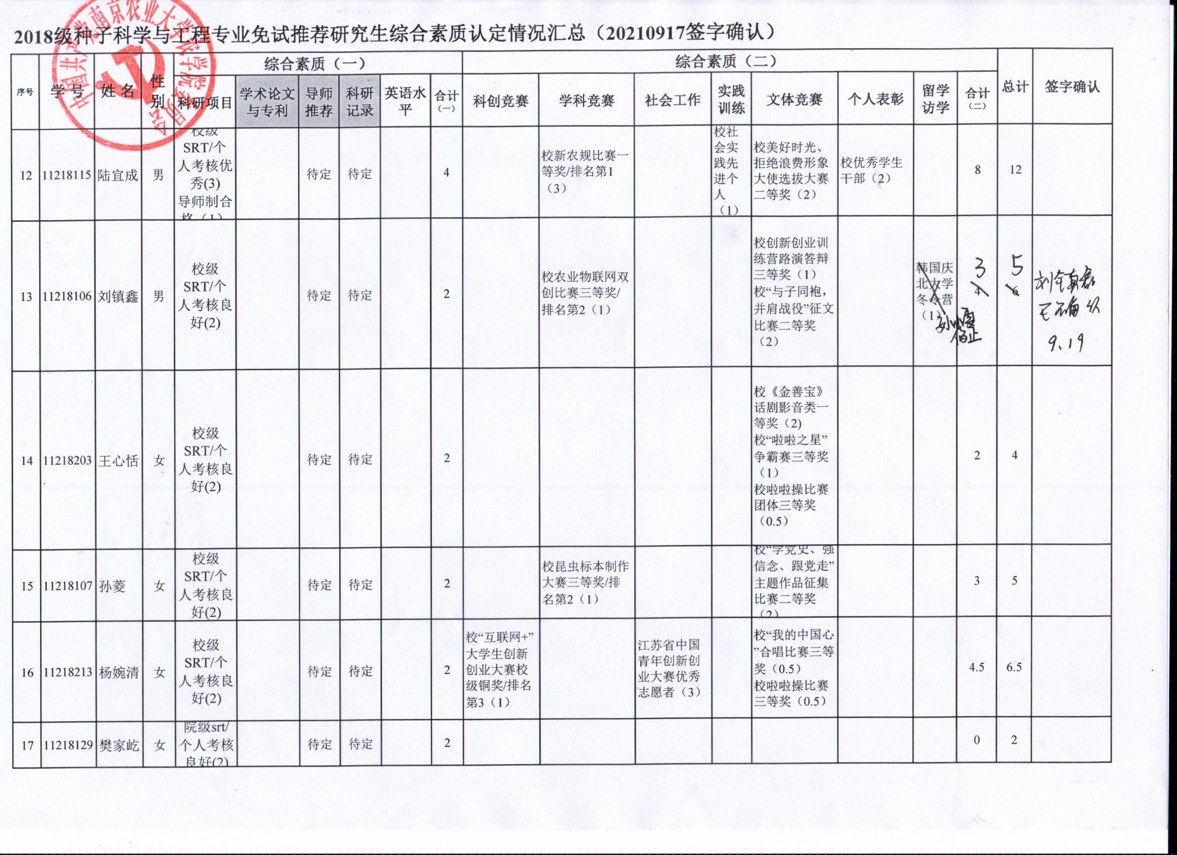 审核及学生签字确认,综合素质(一)第一、五类与综合素质(二)所有类别得分情况已于9月17-19日进行公示,现予以再次公示。