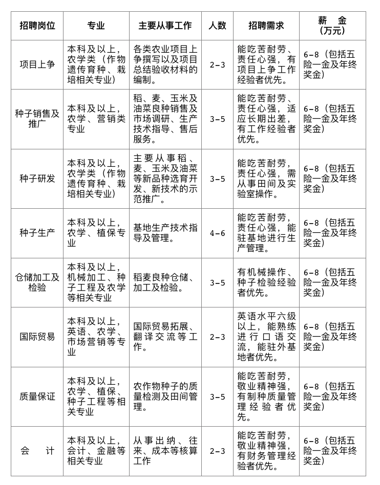 科研育种能力:公司始终坚持科技兴企发展战略,在东北、长江中下游、华南等地区分别建有科研育种中心。在泰州建有研究院、博士后科研工作站、省级工程技术研究中心、省级企业研究生工作站;在南京建有研究所。目前公司在国内建有稻麦新品种测试点80多个,玉米测试点40多个,开辟了杂交水稻品种审定绿色通道和小麦联合体试验。现有科研育种团队36人,与国内多个农业科研院所建立协作关系,先后选育审定杂交水稻品种18个、小麦新品种4个,玉米品种3个,油菜品种2个,还有一大批新品系即将进入审定程序。