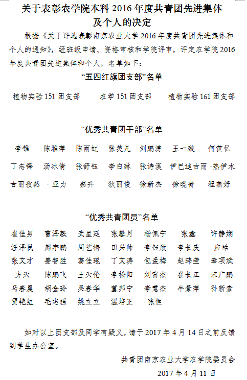 关于表彰DB彩票 本科2016年度共青团先进集体及个人的决定