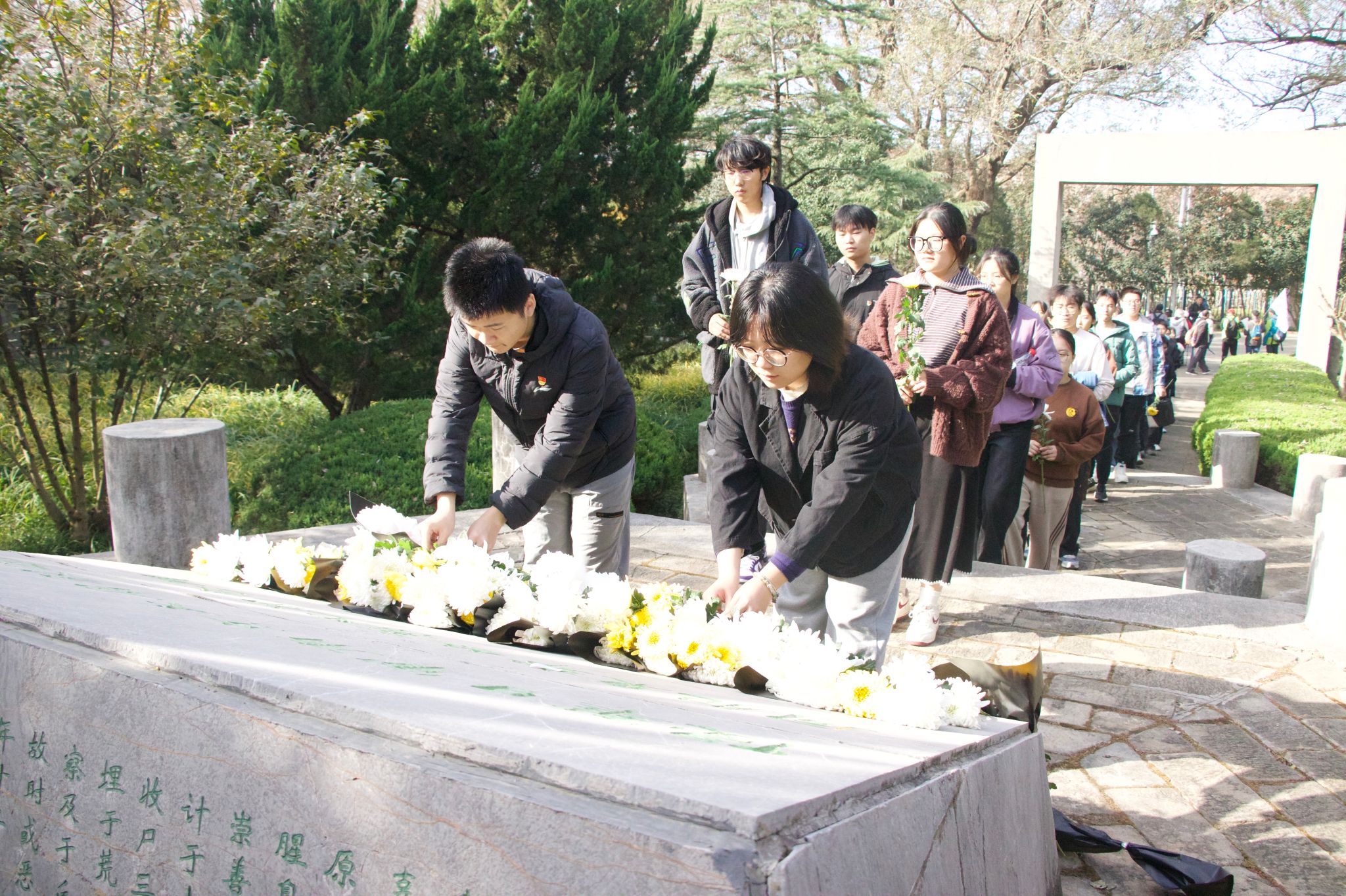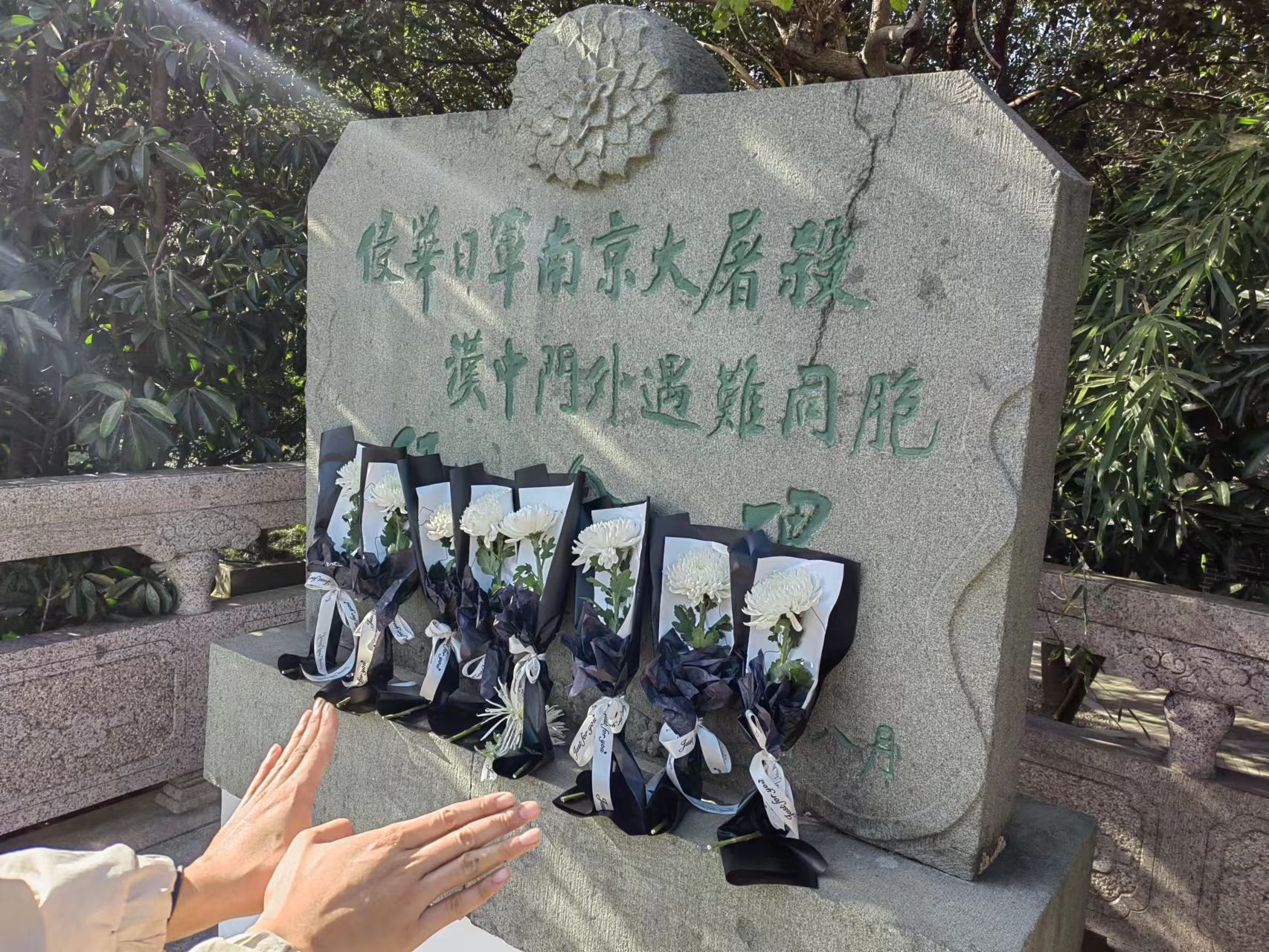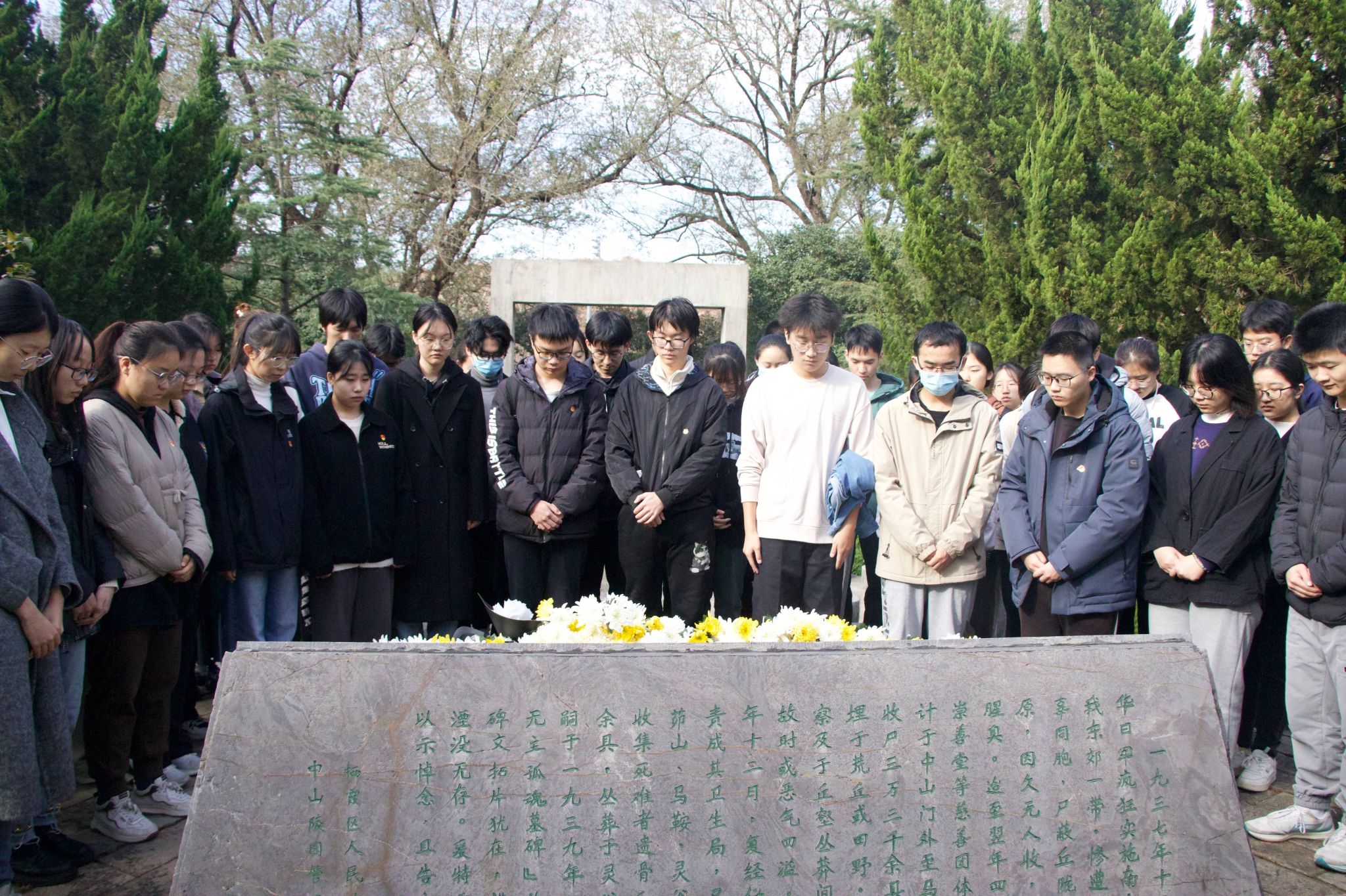 同学们在纪念碑处通过献花和默哀一分钟来缅怀南京大屠杀死难者,缅怀所有惨遭日本侵略者杀戮的死难同胞,缅怀为中国人民抗日战争胜利献出生命的革命先烈和民族英雄。