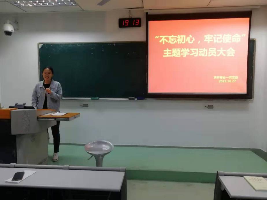 习近平总书记在党的十九大报告中指出,要在全党开展“不忘初心、牢记使命”主题教育,用党的创新理论武装头脑,推动全党更加自觉地为实现新时代党的历史使命不懈奋斗。为积极响应号召,帮助广大学生党员深入学习贯彻习近平新时代中国特色社会主义思想和党的十九大精神,2019年10月27日,农学专业一党支部在主楼组织召开“不忘初心、牢记使命”主题学习动员大会,支部书记王潘婷主持本次动员大会,支部全体党员、积极分子参加会议。