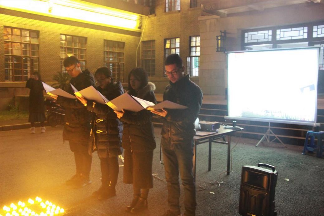 同学们驻足观摩南京大屠杀纪录片片段,回顾南京大屠杀惨痛历史,勿忘国耻,缅怀遇难同胞。本科生党支部书记点燃蜡烛灯,摆出“南京”“12.13”字样,所有参与同学将蜡烛捧在胸前,默哀一分钟,沉痛哀思遇难者。