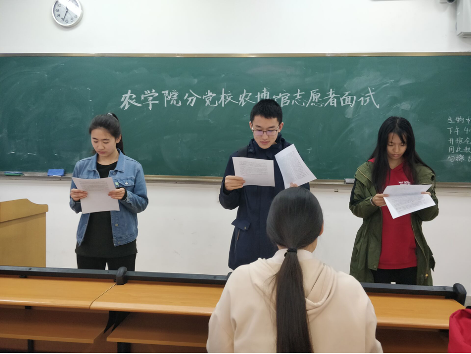 3月27日中午,农博馆讲解志愿者面试在教学楼B105进行。DB彩票 分党校成员担任面试官,此次志愿者招募对象主要面向DB彩票 本科生所有党建班学员。