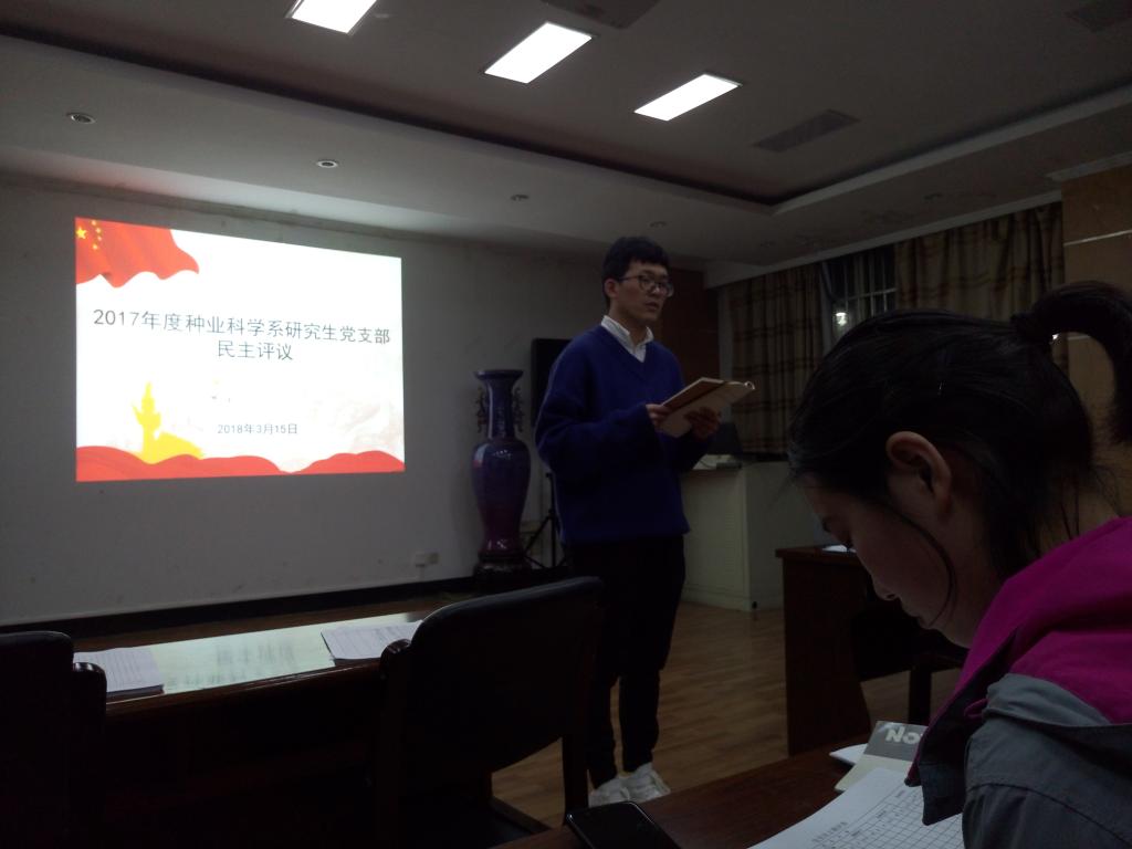 3月15日晚六点半,种业科学系研究生党支部在生科楼E1001召开民主评议会。首先,支部副书记郭凌凯简单总结了过去一年支部的工作,并针对党支部班子民主评议表反馈的信息提出了支部下一阶段的改进方向。接下来是党员同志的民主评议,每位党员根据自我评定的结果对过去一年的表现进行总结反思,确定未来努力方向。本次民主评议加深了支部党员同志之间的认识,同时个别优秀党员同志的先进事迹也为支部其他同志树立了榜样。