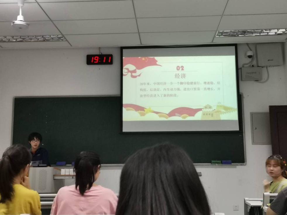 随后,李珏同学就近20年来中国在政治、经济、文化以及社会的发展四个方面展开了细致的介绍,吴志洋同学就生态、综合国力及香港问题三个方面进行了讲解,陆宜成同学分享了最近阅读的书籍《东方启动点·浙江改革开放史》,叙述了九十年代浙江省的政策间接造就了苏南城市群的崛起。