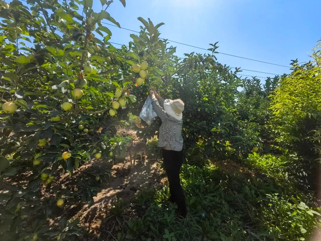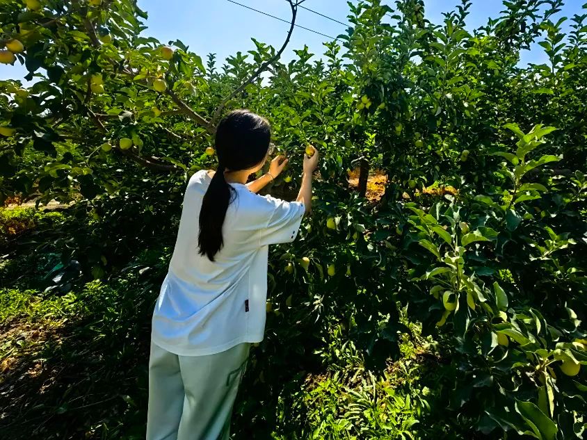 最后实践团来到一处果园,一位憨厚朴实的大妈站在果园处招手。“你们看这果树今年长得真好,尤其是这个苹果,这一棵树上结了好多。还有那边那个蟠桃,我摘给你们尝尝。”大妈很热情,蟠桃很甜,“这几年政策好,之前这果园村里让种都没人种,后面才知道种地政府还给钱,我这就种了,而且每年这些果子也能卖不少钱,那边还有李子树,现在还没熟......”队员也帮大妈摘了许多苹果,摘完之后大妈拿了一袋果子送给实践团,队员们虽然筋疲力尽但内心很甜。小小的苹果是伊吉林莫墩村乡村振兴成果的浓缩,也是无数朴实无华的农民的希望。