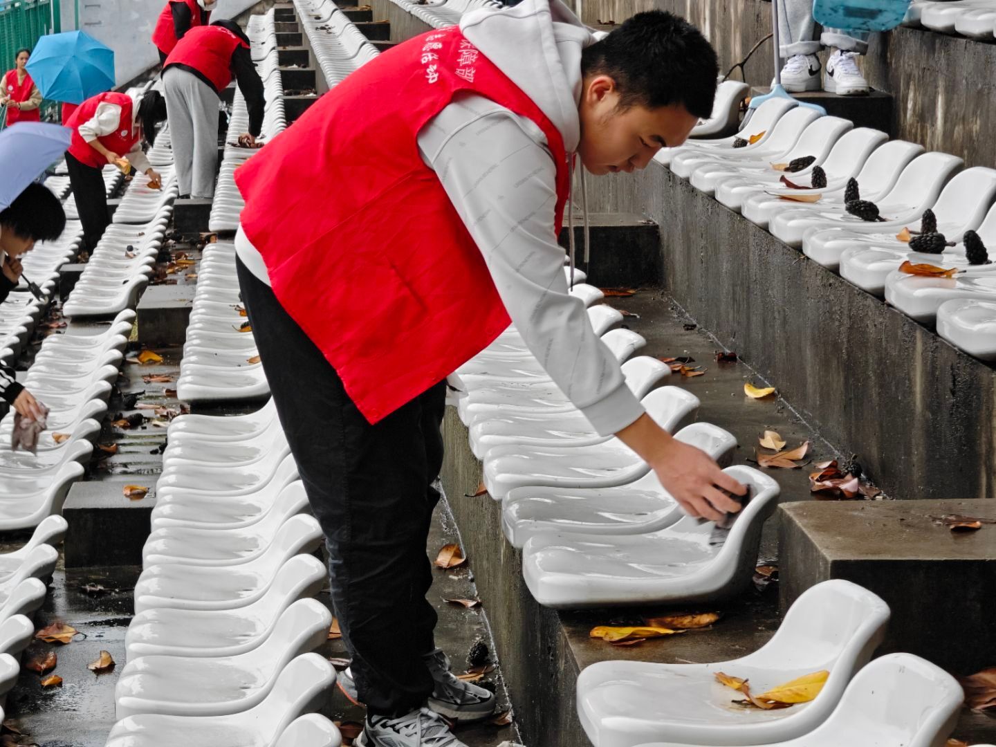 秋意渐浓,天气转寒。在这秋冬交替的时节,为营造更加整洁优美的校园环境,DB彩票 开展了本学期首次阳光清“尘”志愿服务活动。同学们踊跃报名,积极投身于田径场看台的清洁工作中,用辛勤的劳动让校园一角焕发新颜。