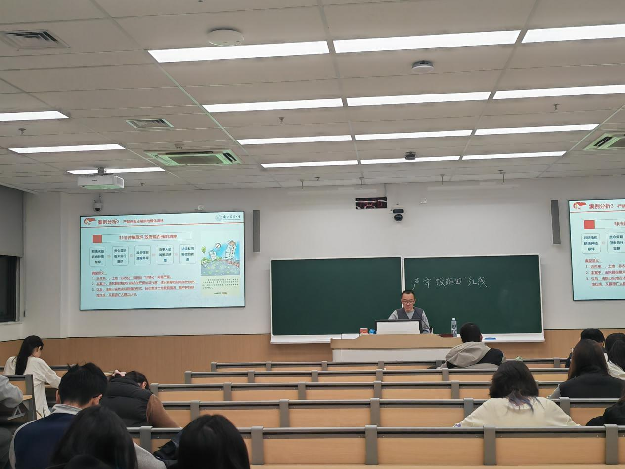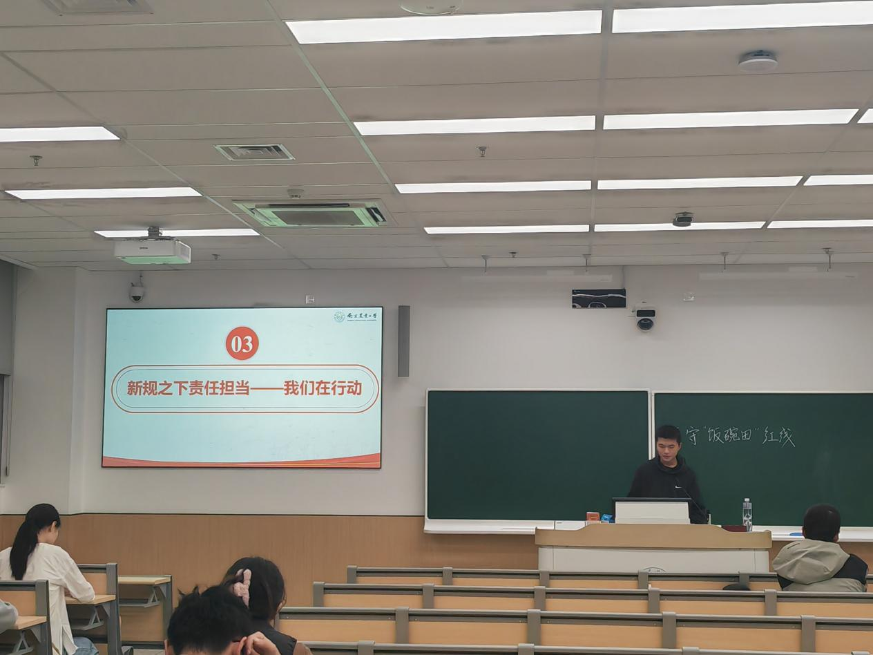 随后,会议进入核心环节。李翔鹤同学聚焦《办法》与“六个严禁”刚性条款,结合“四川荣县某公司破坏永久基本农田案”等典型案例,以案释法,警示大家“红线不可触碰,违法必究”。他强调,永久基本农田是保障国家粮食安全的“饭碗田”,其保护具有法定刚性,任何企图“钻空子”的行为都将受到法律的严惩。