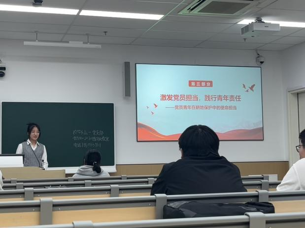 第三部分由农学242班的郎一诺同学主讲。该部分主讲人聚焦党员青年的责任担当,分享了DB彩票 专家参与国家耕地保护立法、全国土壤普查与耕保培训的实例,以及陕西延安“田长守护网络”机制、安徽全椒县“党支部+网格党小组+党员中心户”三级管控体系等基层创新实践,凸显党员在耕地数量守护与质量提升中的先锋作用。