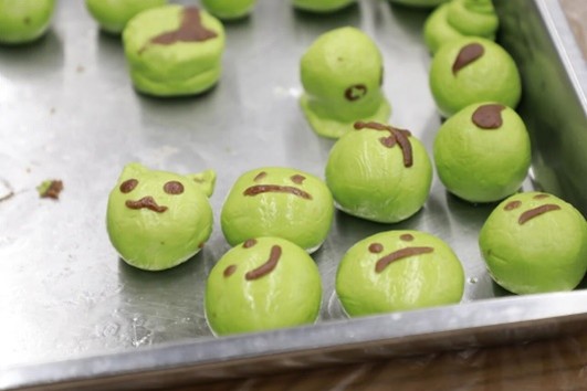 食堂阿姨以艾草汁染绿的糯米,裹住豆沙、肉松等馅料,为师生演示了青团的制作流程。大家开始分组协作,揉面、包馅、收口,各种形态和口味的青团一个个逐渐成型。
