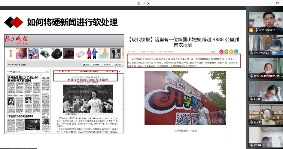 什么是新闻?许老师指出,新闻是新近发生的事实的报道。把握时间是新闻的关键,新闻与旧闻之间存在辩证关系,需要巧处理新闻的“抢”与“压”。许老师从南农笑脸到玫瑰白菜再到南农菊花,用实例为同学们做了详细讲述。