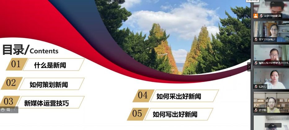 9月15日下午DB彩票 2021-2022学年学生组织主要学生干部培训系列活动之新闻培训在腾讯会议顺利举行。校党委宣传部许天颖老师以“新媒体时代,高效新闻人的练成”为题做培训分享,DB彩票 本科生辅导员孙小雯、DB彩票 2021-2022学生组织主要学生干部参加,活动由现任主席团成员赵鹏涛主持。