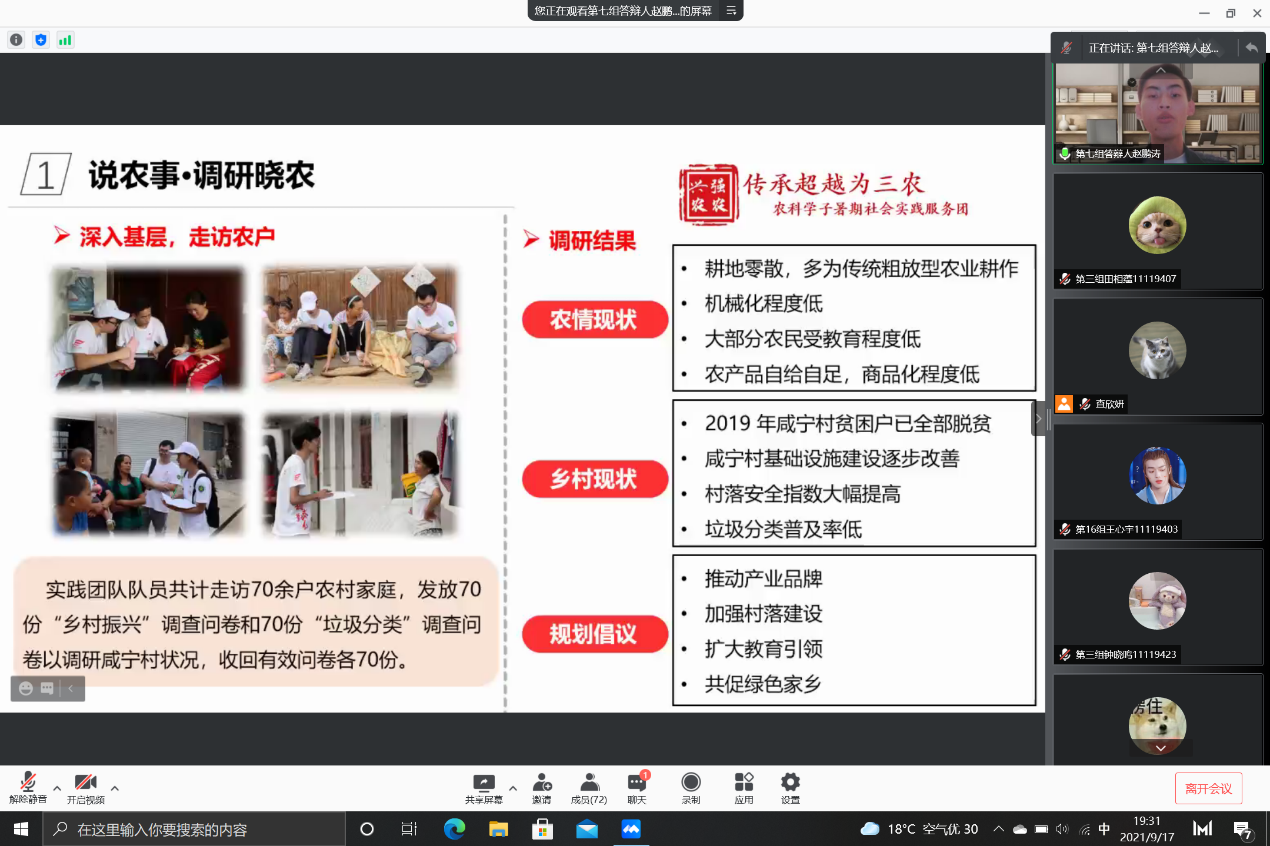 9月17日晚,DB彩票 2021年“三下乡”暑期社会实践总结暨表彰大会在腾讯会议顺利举行。校团委青年发展部部长万洋波、DB彩票 团委书记、学生办主任王彬、本科生辅导员孙小雯、高强老师及2020年社会实践优秀个人代表钟君如出席本次会议,DB彩票 部分二、三年级本科生参加此次会议。