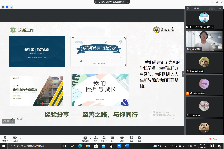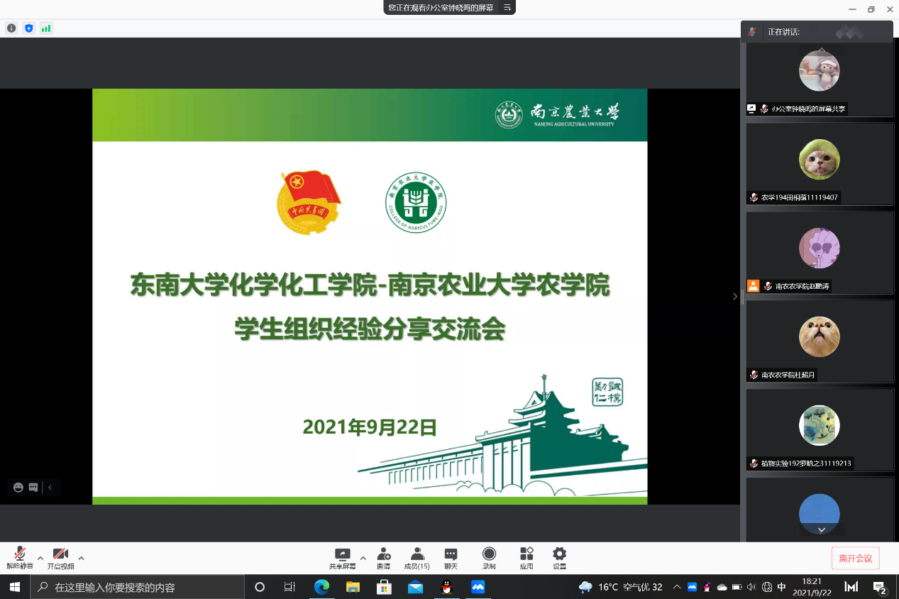 9月22日晚,DB彩票 与东南大学化学化工院2021-2022学年学生组织主要学生干部通过腾讯会议开展了线上经验交流分享会,化学化工DB彩票 辅导员楚俊卿、DB彩票 本科生辅导员孙小雯、2021-2022学年DB彩票 和东南大学化学化工DB彩票 学生组织主要学生干部全体参加会议,会议由主席团成员查欣妍主持。