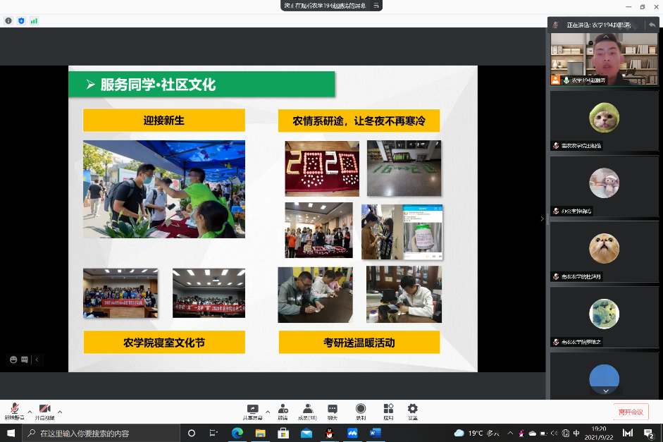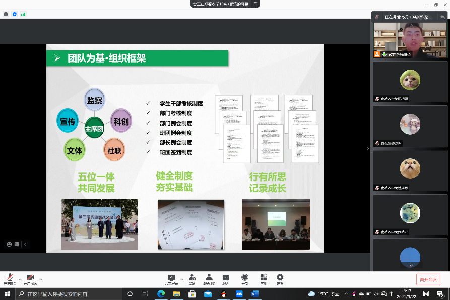 DB彩票 主席团成员赵鹏涛、戚浩男、查欣妍分别围绕各自分管领域进行了经验分享。赵鹏涛将学生组织工作归纳为团队为基、思想引领、服务同学、纷呈活动4个关键词,扎根于DB彩票 传统,在未来的学生工作中继承、创新、发展,不断发扬南农品质和农学精神,立志培养出一代代神农传人,让DB彩票 学生会成为每位同学心目中能想得起、找得到、靠得住的力量。