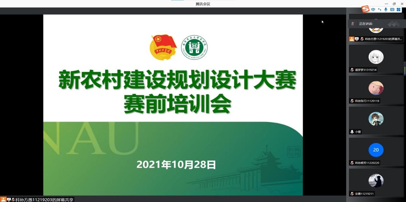 10月28日晚,由DB彩票 承办的DB彩票 第十五届新农村建设规划设计大赛赛前培训会在线上举行,DB彩票 卞新民教授受邀为大家做培训,DB彩票 本科生辅导员孙小雯主持本次会议, 共55个参赛团队300余人参加了此次会议。