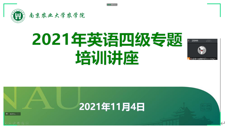 11月4日晚,DB彩票 英语四级专题培训讲座在腾讯会议上顺利举行,主讲人为新航道英语机构陈小梅老师,DB彩票 100余名本科生积极参加了此次讲座。