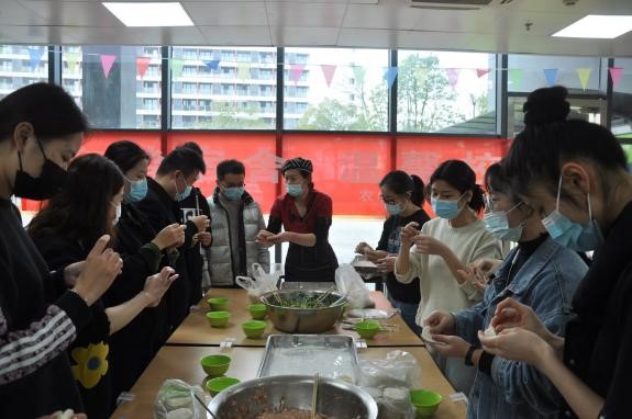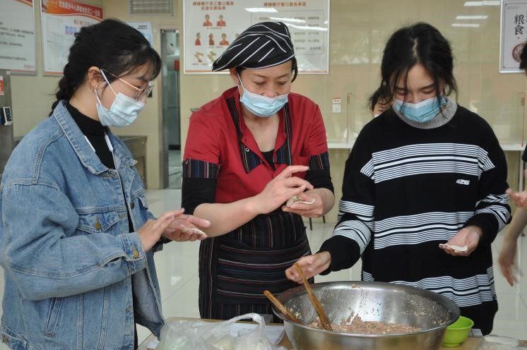 下午3点半,同学们齐聚牌楼食堂,自由分组分工,一边包饺子,一边交流家乡的风俗和包饺子技巧。有的同学不会包没关系,在食堂阿姨的示范下,先轻巧的将中间的馅料包上,饺子皮边缘沾上水,轻轻捏出褶皱,再用双手轻轻挤压,一个个饺子就完成了。大家各显身手,包的饺子有模有样,造型各异。