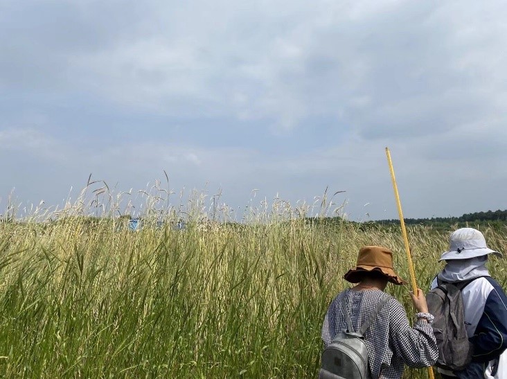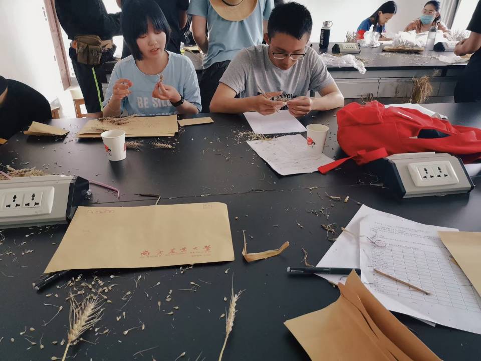 有的实验工作量很大,同学们分成若干小组,组内分工明确,组间互相协作、答疑解惑。随着实习进程的推进,各个小组都已经默契非常,能够有序且高效地完成各项任务。走近种满各类小麦的麦田,便会看到散布在四处的实验小组,一个小组中有的人拿着长尺和短尺测量植株,有的在数据记录本上飞快记录,还有的对典型性状拍照留存。安静的田间时时响起报数据和交流问题的声音。即使烈日炎炎,汗流浃背,也有很多小组热情满满地穿梭在田间。