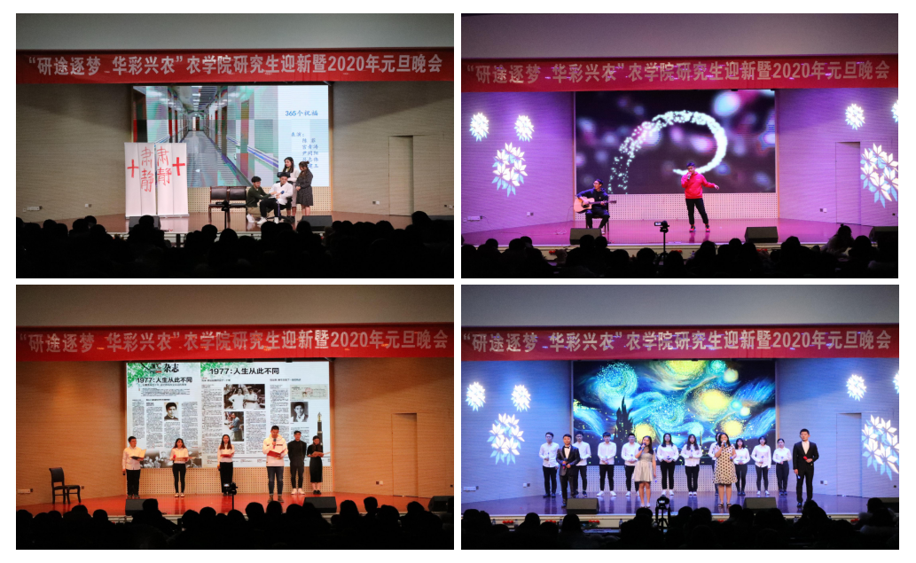 活动开始前播放了新年祝福视频,随后热情洋溢的开场舞拉开了本次晚会的帷幕。晚会分为三个篇章,第一篇章:凝聚·希望。今年是祖国母亲的70华诞,开篇以突出爱国情怀为主旋律《歌唱祖国》激发师生内心的自豪感和自信心,展示了农学人对祖国的崇敬与希冀。小品《365个祝福》表达了对新的一年美好祝愿。第二篇章:逐梦·青春,突出青春向上的靓丽色彩。一首《不 cold 该 play》打动了场下的许多观众。作为当代研究生,我们肩负着历史使命和时代责任,朗诵《少年中国说》慷慨激昂,感人肺腑。属于DB彩票 的《青春disco》燃爆现场,贴合了学科特色,又与时尚元素结合,赢得了同学们的掌声。第三篇章:仰望·星空,整个篇章以中国传统文化为特色,继往开来。歌曲串烧《新的心声》,带着对未来的憧憬与收获的期盼站在春天的门槛,同一片星空下《仰望星空》,以最真实的渴求,一同追寻属于农学人的星空梦想。最后,晚会在歌曲《相亲相爱》中圆满结束。