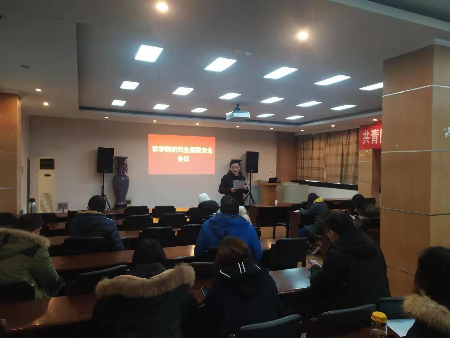 他还提醒研究生一是各课题组要做好学生寒假离校情况统计工作,掌握学生离校、返校动向,关心关注寒假在校期间学生的思想、学习、生活、健康等情况,加强安全知识宣传教育;二是组内要认真开展好宿舍、实验室、学习室等场所安全隐患检查,做好假期的用电防火、防盗安全工作;三是要重视寒假期间在校学生宿舍、实验室安全工作,严禁宿舍内吸烟和使用明火,杜绝私拉电线和使用违章电器,最后离开的同学检查宿舍门窗、电源、电插板、空调、热水器、水龙头等确保关闭不留安全隐患;四是假期中注意饮食,出行时注意交通安全。警惕网络安全,发表言论正面、理性。不参与不良信贷,谨防各类诈骗。
