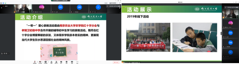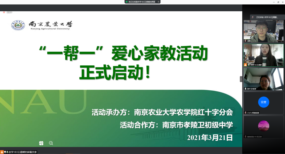 2021年3月21日上午9时,DB彩票 红十字分会在线上腾讯会议举办了本学期“一帮一”爱心家教启动仪式。DB彩票 高强老师、孝陵卫初级中学许凤银老师、来自DB彩票 的志愿者和孝陵卫初级中学的八年级同学及其家长参加了本次启动仪式。本次启动仪式由DB彩票 红十字分会部长王偲媛同学主持。