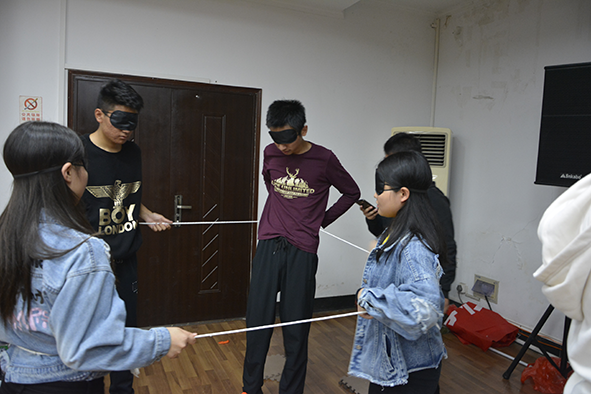 第二个环节是“盲人方阵”。每一个成员积极投入其中,互相配合,建立团队合作意识,培养团队合作能力。