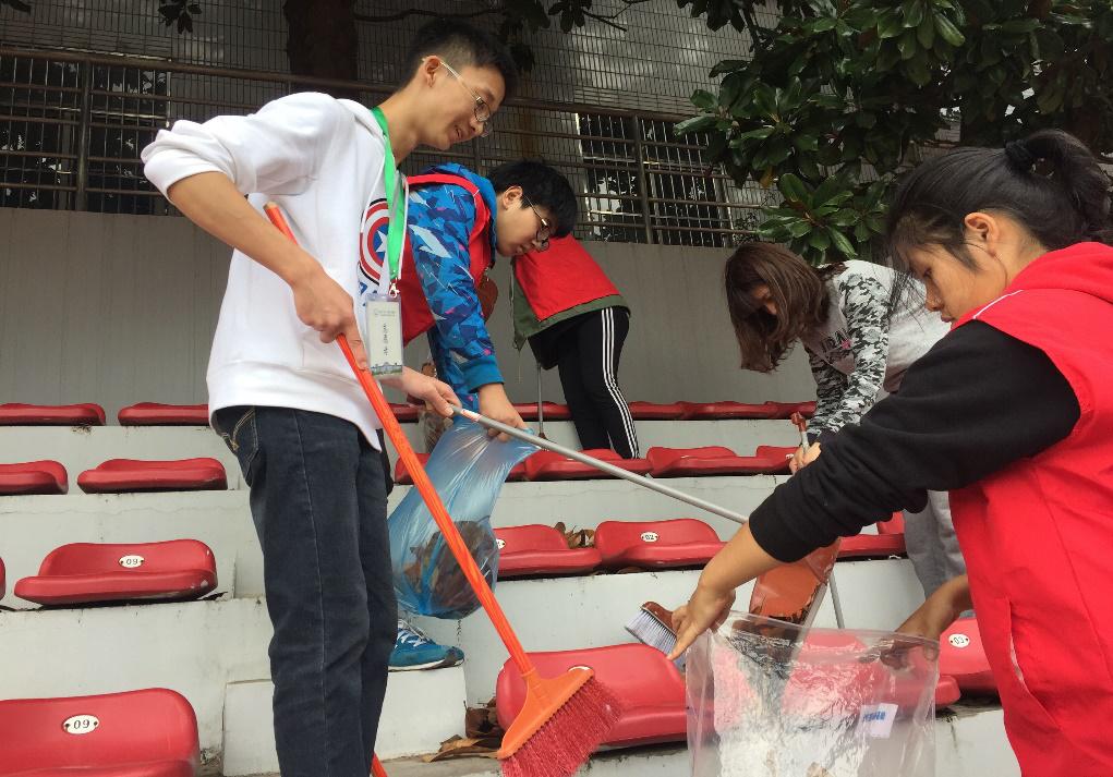 环绕体育场的观众席有很多落叶、纸屑、尘土等,志愿者们手执帕子、扫帚,擦拭座椅、拾起落叶纸屑、扫去尘土。分工明确,每个人积极投入,为维护校园的“每一寸地”奉献力量。