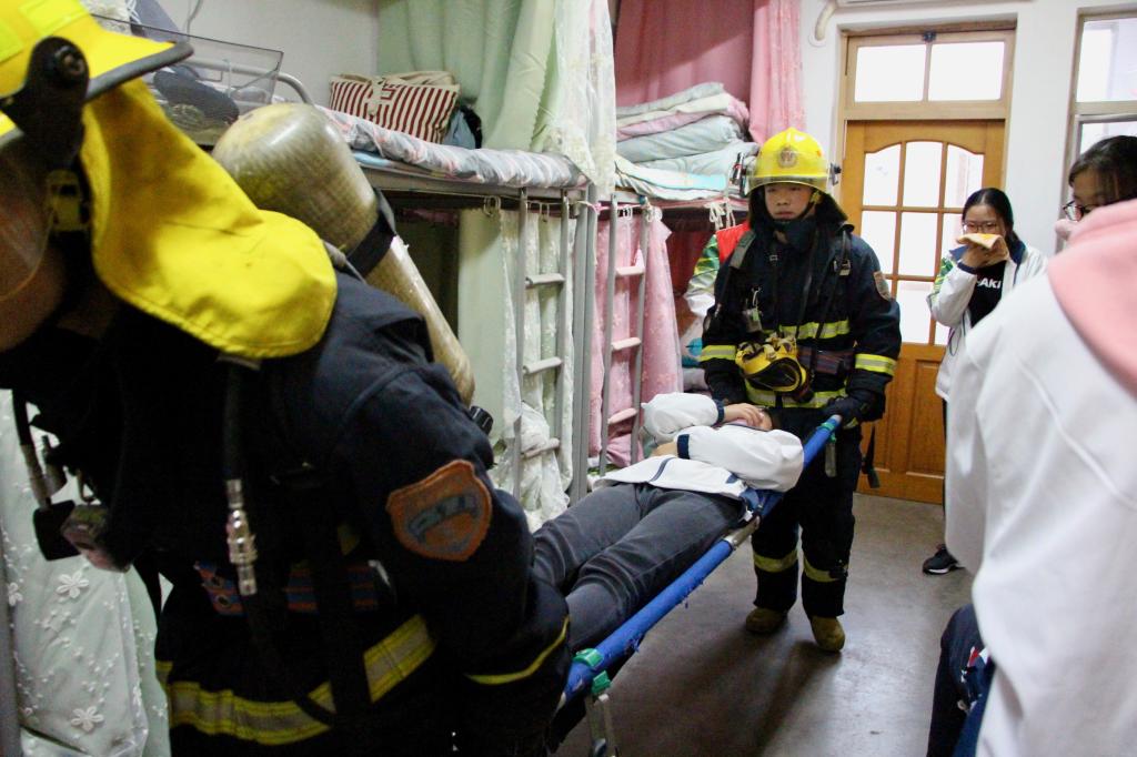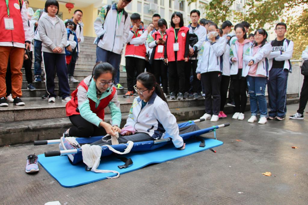 11月8日下午四点,消防演习正式开始。由南京市消防支队派出的三辆消防车在指定地点就位,消防支队的队员们严阵以待。疏散演习一开始,现场升起滚滚浓烟,警报拉响几秒后,消防官兵火速赶到南苑十三舍进行灭火。同学们掩住口鼻,有序逃生。全体同学在两分四十六秒内在安全地点集合完毕。疏散演习之后,校红会成员杨雪针对三位在“火灾”中负伤的“伤员”的不同受伤部位,为大家讲解了如何应对小腿骨折、前臂骨折和手掌受伤等突发情况,并对这些部位一一演示如何包扎。同学们听了她的讲解以后受益良多。参加了演习的赵亚南同学说道,“经过这次活动我才体会到消防官兵的辛苦,才真正明白消防演习的重要性。”