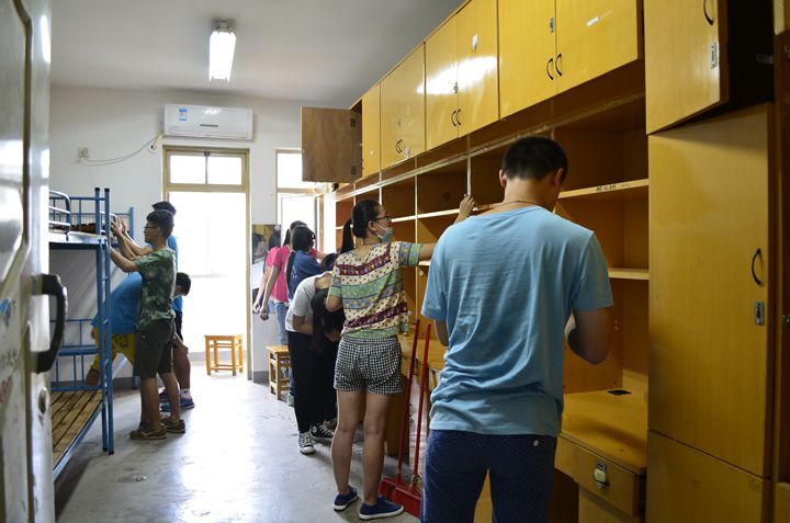 下午2点,各小组的负责人带领大二同学从各自的宿舍拿来笤帚、抹布等工具,准时到达各自负责的十三舍和二十舍,开始进行卫生大扫除。天气比较炎热,但大家丝毫不懈怠。他们对柜子、抽屉里的杂物进行了清理,桌椅、门窗、地面也打扫的干净整洁。