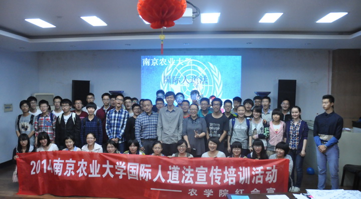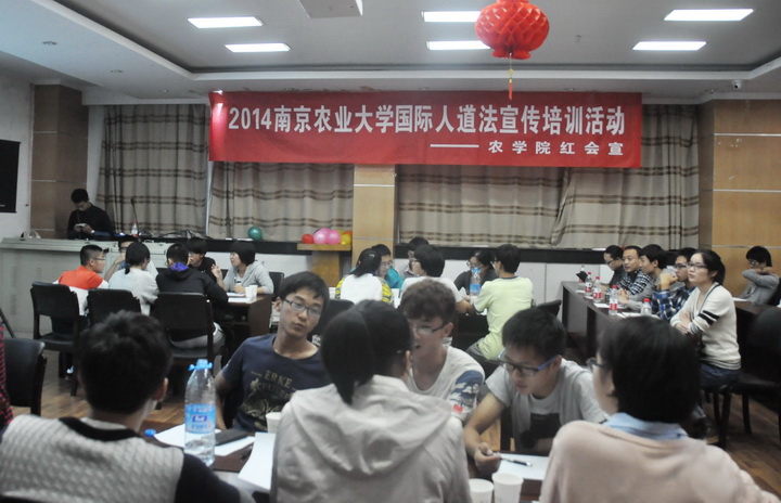 10月26日,2014年DB彩票 国际人道法宣传培训活动在生科楼E1001多功能放映厅举行。江苏省红十字会陈大玲老师、南京市红十字会江伟老师、DB彩票 辅导员王彬老师、DB彩票 红十字会会长刘航和DB彩票 红十字会会长李吉以及部分DB彩票 14级本科生参加本次活动。活动由校红会国际人道法培训主持人李甜甜和DB彩票 文艺部池驰主持。