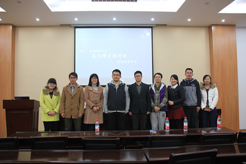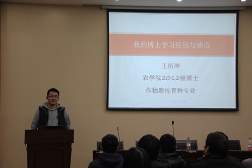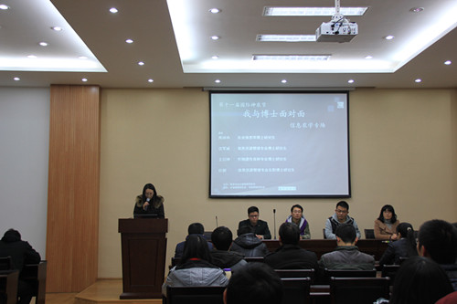 教学楼7楼报告厅举行。2014级农业信息学在读博士研究生高珍冉、2013级信息资源管理专业博士研究生沈军威、2012级作物遗传育种专业博士研究生王衍坤、信息院情报学在职博士任妮作为嘉宾参加了此次活动。