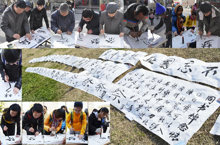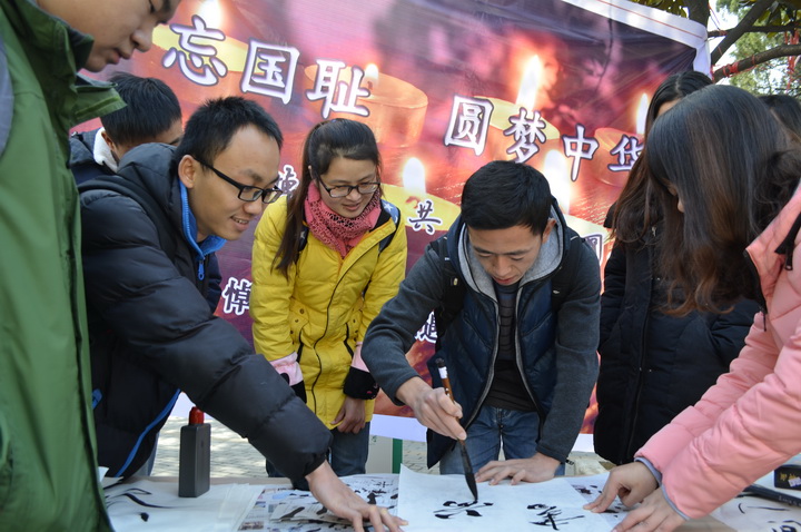 活动中,师生以中国传统文化瑰宝——书法,共书“祭”字,以表达哀悼之情;同时,以书法“梦”字,表达他们对实现中华民族伟大复兴的中国梦的坚定信念。原DB彩票 副校长王耀南教授,DB彩票 杨世湖教授、陈佩度教授和黄丕生教授等亲临活动现场挥毫泼墨,表达缅怀之情。王耀南教授题下了“不忘国耻,振兴中华”八个大字,表达了他对青年学生的殷切期盼,他希望广大青年学生能够铭记历史,缅怀过去,在新时代的起点上,不畏艰险,奋勇拼搏,用自己的智慧和双手托起祖国更加繁荣的明天。此外,还有少数民族学生、留学生参加到此次活动中来,他们或用维语,或用英语,表达他们的悼念之情。