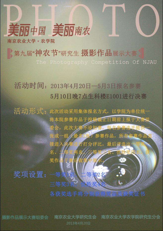 4月20日,由校研究生会主办、DB彩票 研究生分会承办的第九届“神农节”研究生摄影作品展示大赛火热开赛。此次摄影大赛以“美丽中国,美丽南农”为主题,用同学们手中的相机,记录下南农美丽的瞬间,更好的落实党的十八大精神,让世界了解美丽中国,让大家认识美丽南农,充分展示南农的独特的丰富文化内容同时,此次活动作为DB彩票 第九届“神农科技文化节”的一部分,旨在丰富DB彩票 研究生的课余文化生活,彰显出南农研究生的别样风采。