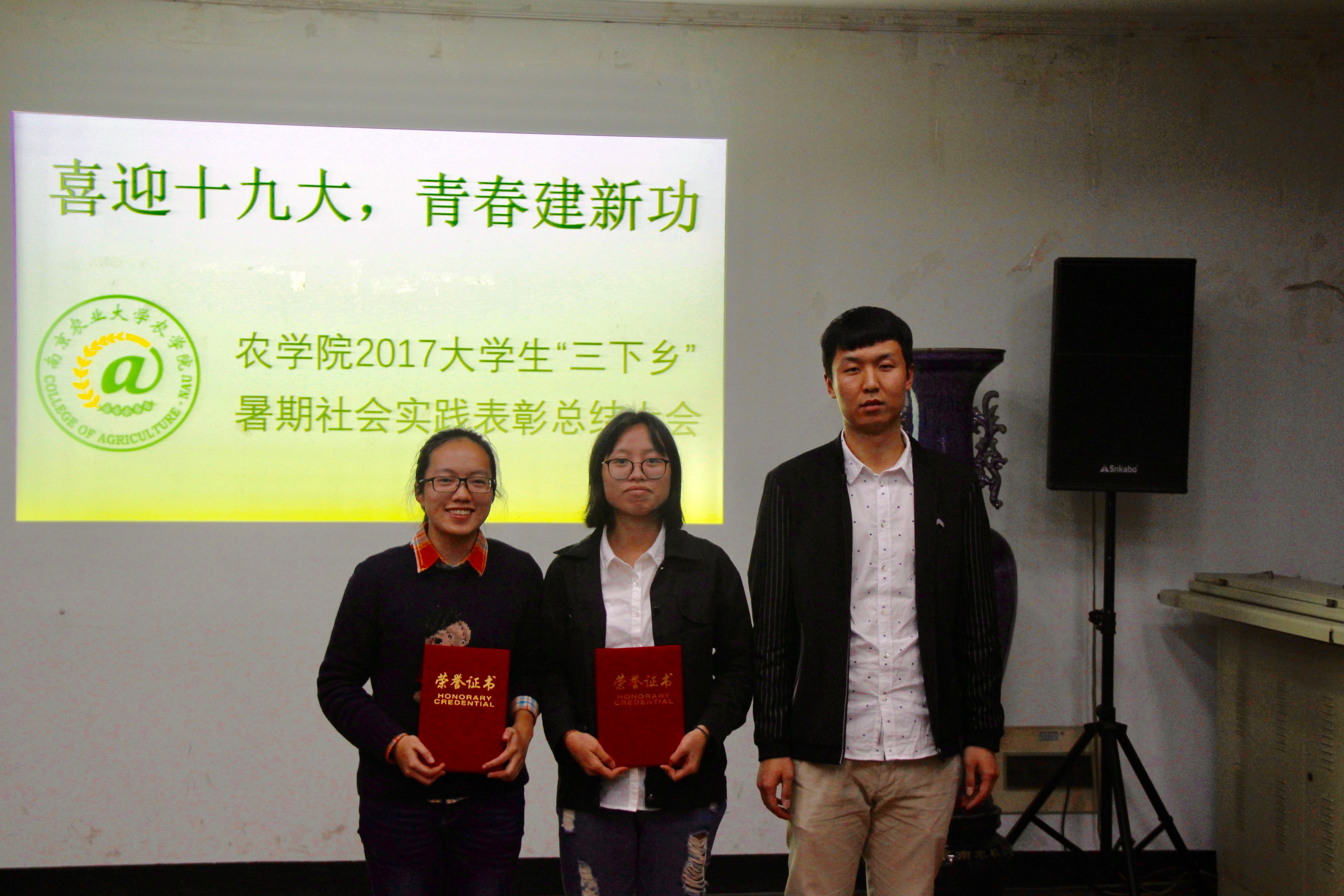 在2017年大学生“三下乡”暑期社会实践中表现突出的丹阳稻鸭调研团、紫砂文化调研与传播、新农村改革发展调研团、现代化农业技术发展、“产业化支农”精准扶贫调研团等14个实践团队上台分享实践中的调研故事、感人细节等,鼓励学弟学妹“把自己的事情做扎实,把改革发展稳定的任务落实好,一步一个脚印朝着梦想奋进”。