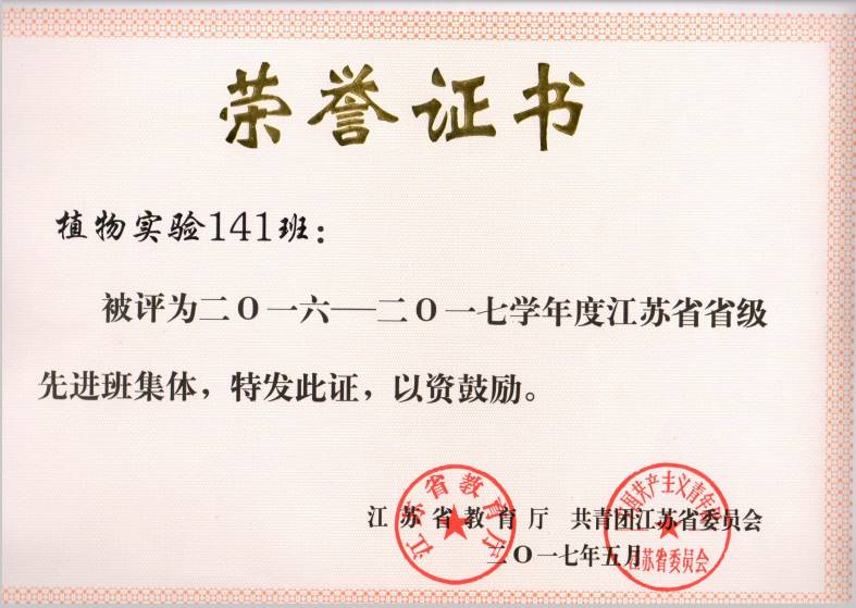 DB彩票 金善宝实验班(植物生产类)植物实验141班团支部,一个由通过层层选拔遴选出来的学子组建的特殊家庭,一个充满竞争和激情的集体。支部先后荣获江苏省“五四红旗团支部”、江苏省“先进班集体”。DB彩票 “十佳班级”、“先进班级”、“优秀团支部标兵”、“优秀团支部”等近10项荣誉称号,支部“放飞梦想,实现自我”主题团课被评为校“优秀团课”,支部内共计23人获得过校级及以上荣誉。始终坚持高起点、高标准、高水平的“三高”发展战略,植物实验141班团支部一步一个脚印,坚实地向着卓越迈进。