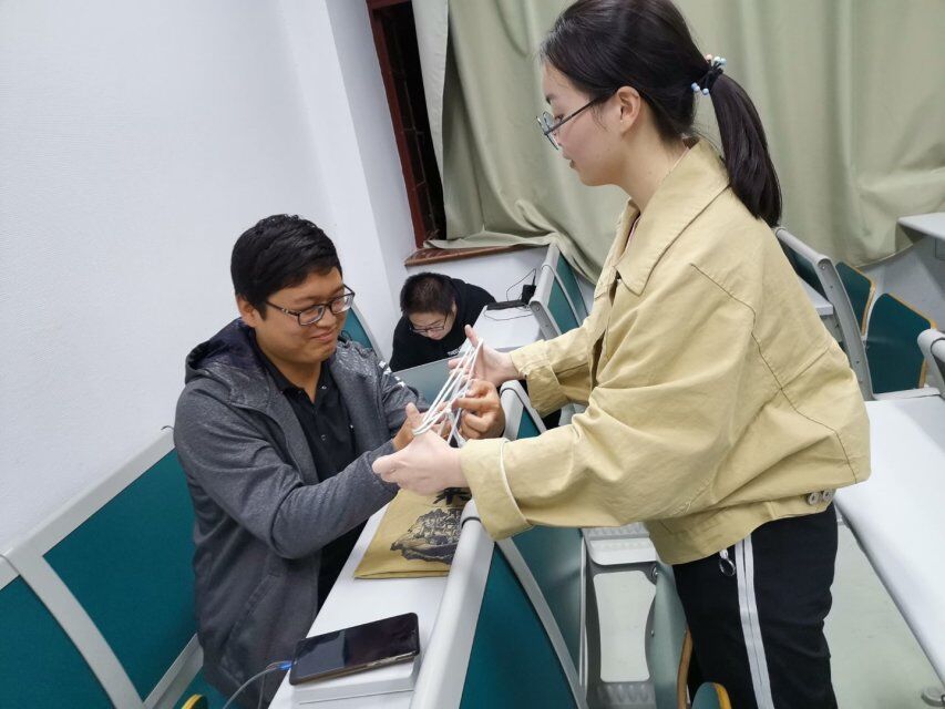首先主持人说明了此次交流会的目的和大致流程,在结束了第一环节的自我介绍之后,活动进入了最为活泼的游戏时间。同学们接成语、玩花绳,在一轮轮的循环中享受着文字和手工的快乐。