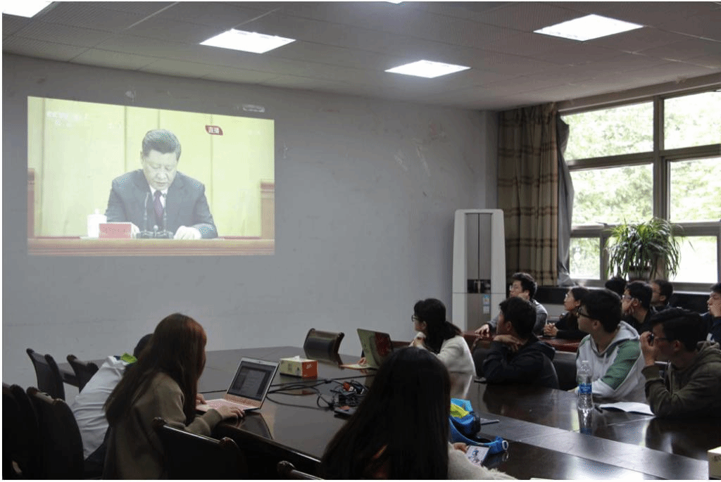 2019年4月30日上午10:30,纪念五四运动100周年大会准时召开。DB彩票 组织DB彩票 团委学生会及DB彩票 研究生会部分学生代表在生科楼B1013会议室集体观看直播,学习会议精神。