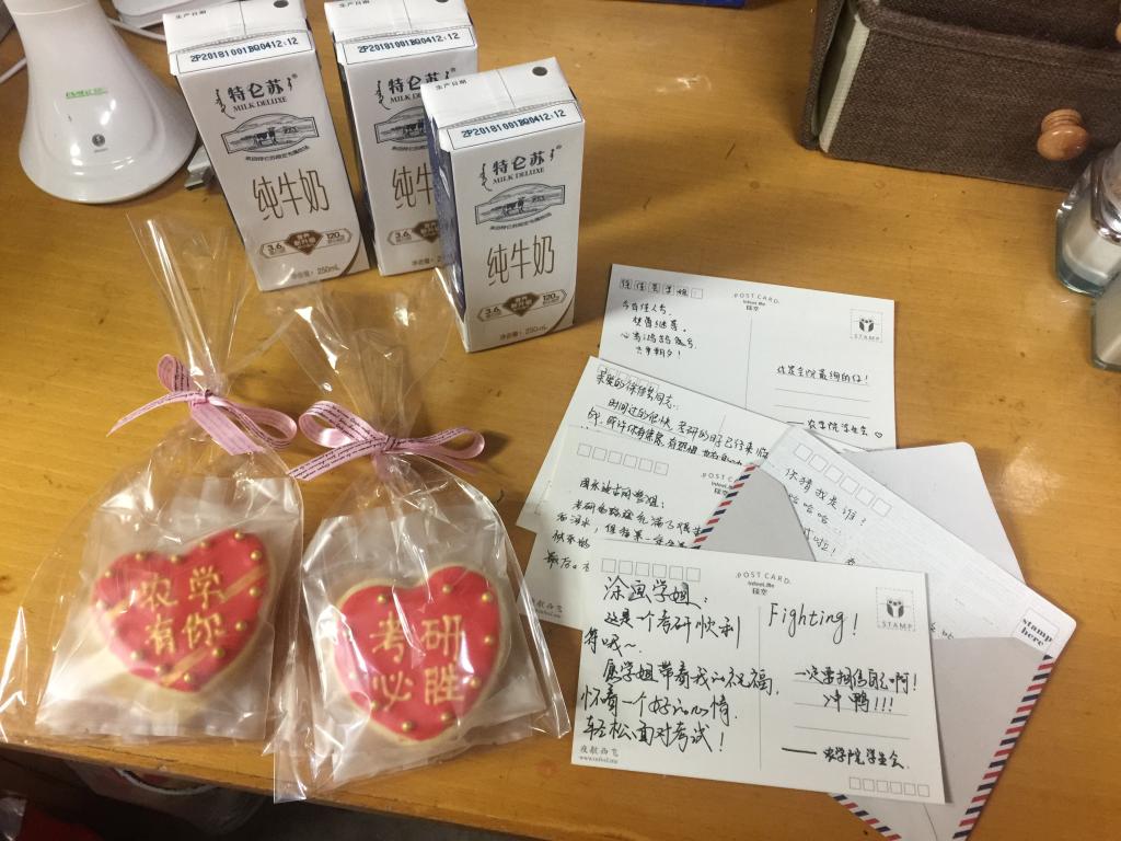 据悉,在研究生入学考试到来之际,DB彩票 组织活动,第二次为每位考研学子送去祝福和礼物。在第一次送出的水果与爱心便签取得良好反响后,本次送出的“温暖”更加别出心裁,心意满满。除了承载学生会同学祝福的明信片外,还准备了营养丰富的牛奶以及标有“农学有你”、“考研必胜”字样的定制饼干。