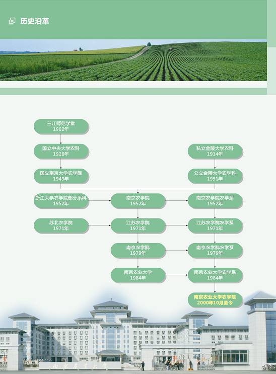 DB彩票 是我国创立最早的农学系科之一,与DB彩票 历史同源,可溯源至1902年三江师范学堂农学博物科和1914年金陵大学农学本科。中央大学DB彩票 前身可追溯为三江师范学堂农学博物科、南京高等师范DB彩票 农业专修科(1917年)、国立东南大学农艺系(1921年)、国立中央大学DB彩票 农作物门(1927年)、农艺垦殖科(1929年),1932年恢复农艺系,南京大学DB彩票 农艺系;金陵大学前身为1914年私立金陵大学农学本科,1926年成立农艺系和1951年的公立金陵大学农艺系。1952年,中央教育部召开全国DB彩票 院长会议,做出调整全国高等农业院校的决定,会议上决定成立南京DB彩票 ,主要由金陵大学DB彩票 、南京大学DB彩票 和浙江大学DB彩票 部分系科合并,其农学系为DB彩票 前身;1971年,根据江苏省革委会意见,随南京DB彩票 搬迁至扬州与苏北DB彩票 合并成立江苏DB彩票 设农学系;1979年,根据中央办公厅“关于南京DB彩票 复校问题”的电报指示,随南京DB彩票 迁回南京;1984年,DB彩票 更名,前身为DB彩票 农学系;2000年9月,根据DB彩票 教学机构调整要求,农学系更名组建DB彩票 。